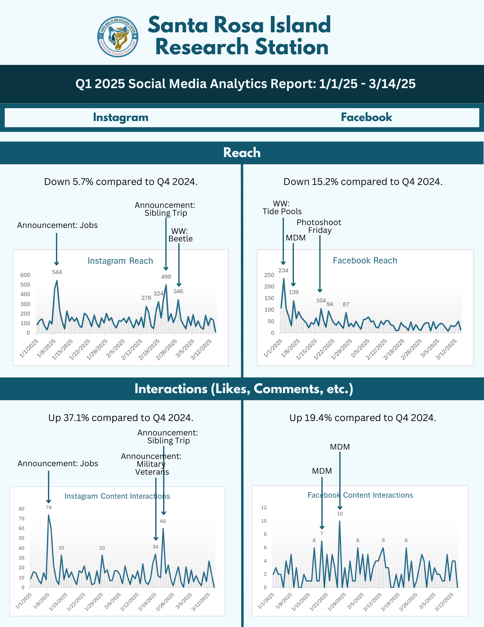 I manage the captions, hashtags, and scheduling of posts in Meta Business Suite for Santa Rosa Island Research Station’s Instagram and Facebook social media platforms. Additionally, I create quarterly analytics reports that provide valuable insights and strategic recommendations to improve key metrics for the next quarter.